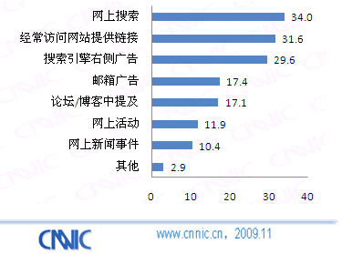 通過網絡了解購物網站的用戶,主要是通過網上搜索和網站鏈接進入購物網站,分別有34%和29.6%的網民是通過網上搜索和搜索引擎廣告進入購物網站的。顯示了搜索營銷及網絡聯盟在吸引網民點擊,進而實現用戶轉化上的重要作用。