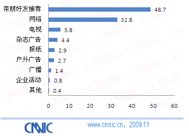 口碑是用戶知曉B2C網站的重要因素,親朋好友的推薦成為網民嘗試網購的主要原因。網民知曉購物網站最多的方式是通過親朋好友推薦,占比達到48.7%。 其次是網絡渠道,有32.8%的人通過網絡知曉購物網站。通過傳統媒體得知購物網站的比例較低,通過電視、雜志和報紙的用戶比例分別只有 5.8%,4.4%和2.9%。由此可見,口碑營銷和網絡營銷是目前電子商務市場拓展最重要的兩種模式。