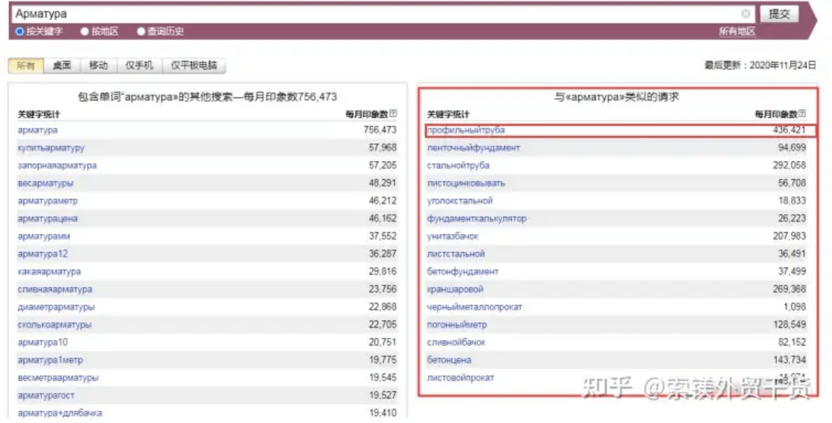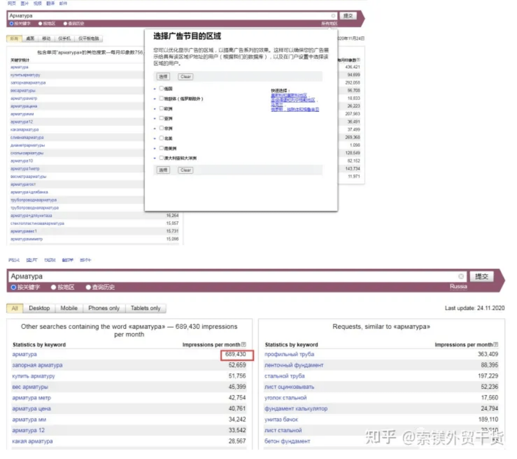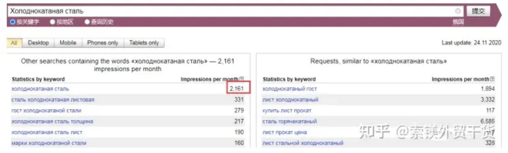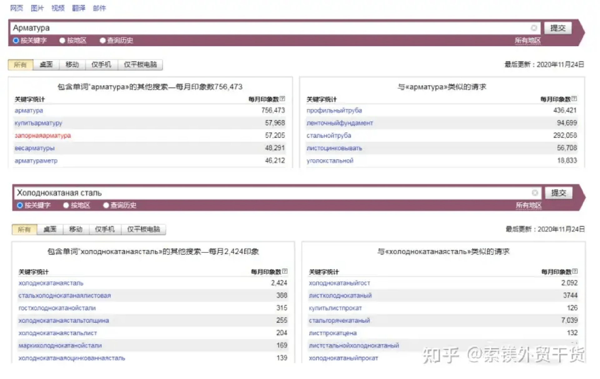 分別輸入鋼管企業常見的出口產品,這里我們選擇Арматура(螺紋鋼)和Холоднокатаная сталь(冷軋鋼),可以看到螺紋鋼的搜索量為756473,遠高于冷軋鋼。
