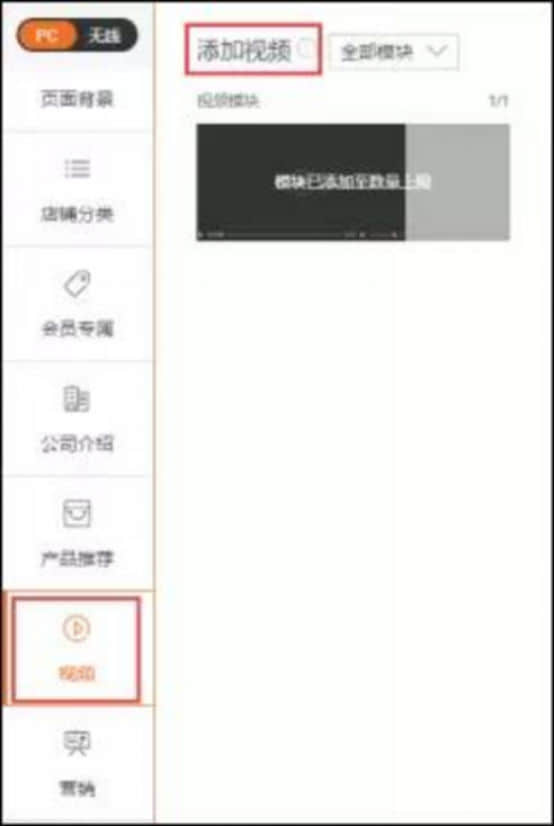 進(jìn)入旺鋪2.0 PC旺鋪首頁/自定義頁的編輯器,在左側(cè)導(dǎo)航欄的【視頻】模塊中,拖拽并添加到裝修展示區(qū)。