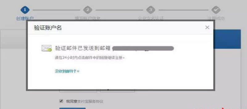 第五步:系統會將驗證郵件發送到之前填寫的郵箱。登陸該郵箱,在收件箱找到來自支付寶的郵件,并點擊網址鏈接,完成郵箱郵件驗證。