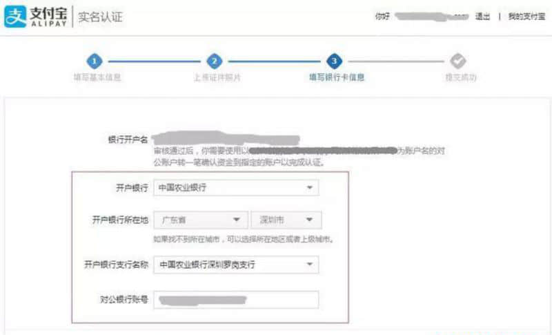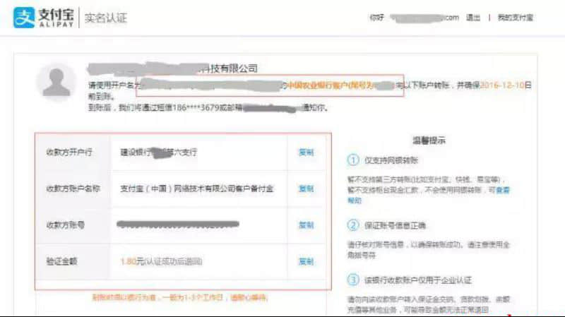 **步:2天內收到系統“審核完成”的提示之后,登陸賬號,并根據上面的提示,用之前提交的對公銀行賬戶向指定的支付寶收款賬戶充值1.08元,完成驗證。