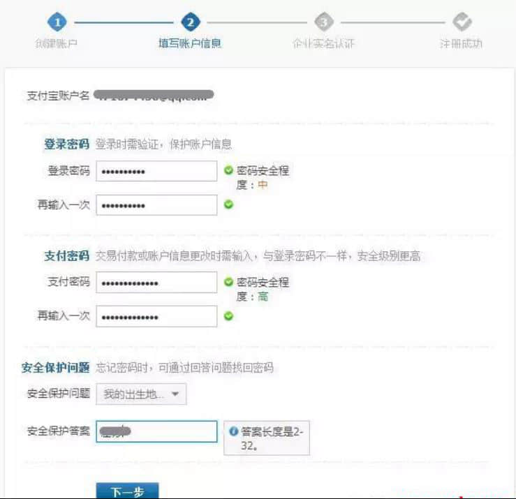 **步:按要求設置“登錄密碼”、“支付密碼”和“安全保護問題”(密碼設置**使用數字、字母、符號的組合,增強安全系數,自己設置的問題要記得答案),完成后點擊下一步。