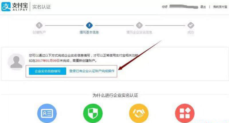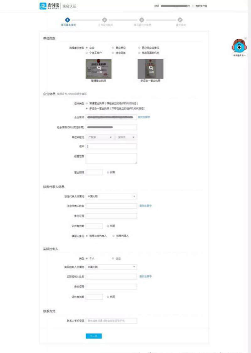 第二步:支付寶賬戶信息填寫完之后,進入企業實名信息填寫。